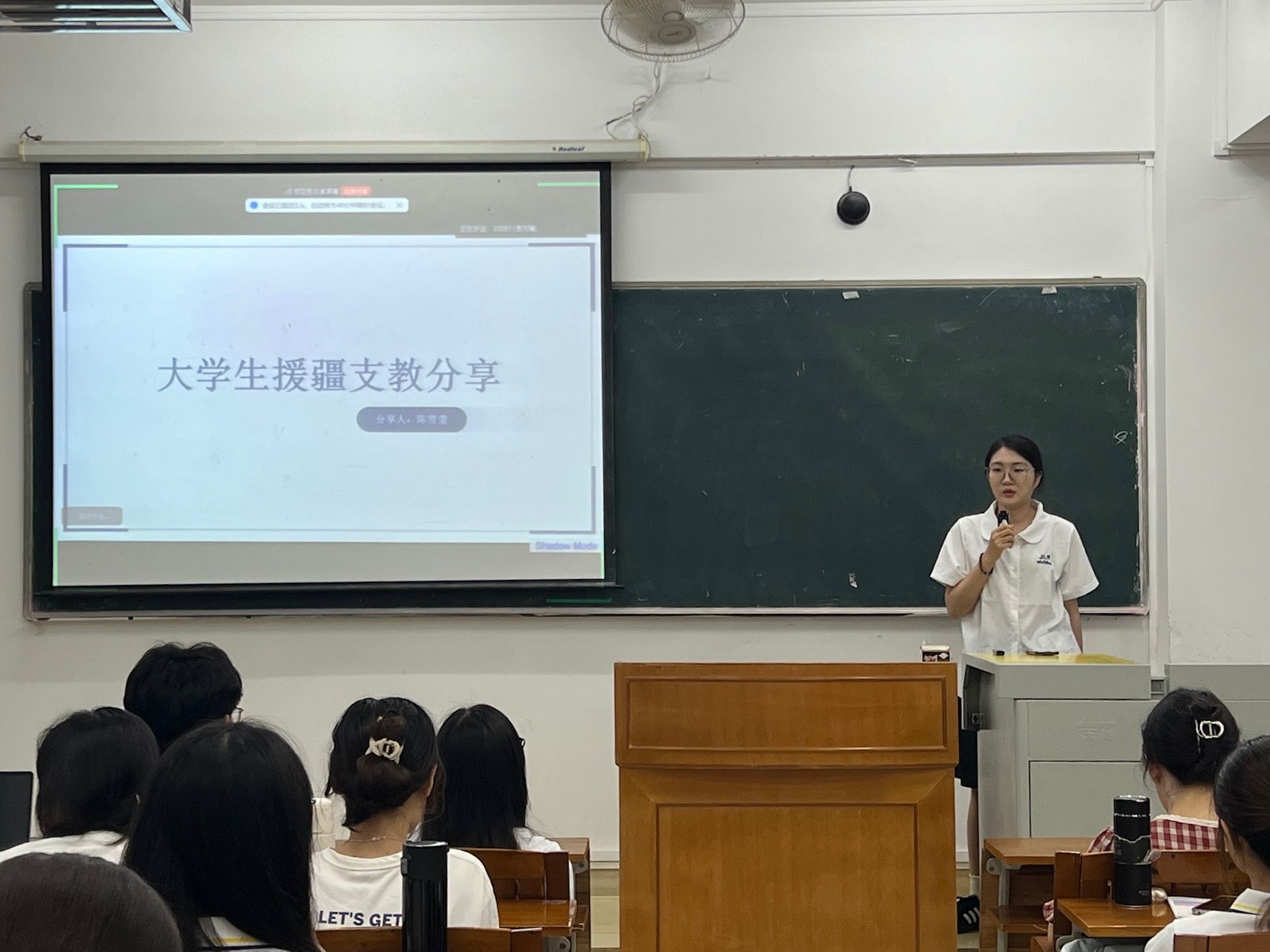 在援疆支教分享环节,陈雪莹同学分享了她的援疆支教经历,从支教工作概述、准备、教学实践和个人成长等方面展开。她讲述了在新疆南疆的支教生活,虽然面临孤独感、语言障碍等挑战,但通过开展丰富的活动、进行公开课教学,不仅将内地教育理念带到新疆,也提升了自身的教学技能和综合能力。她还介绍了公司援疆支教的招新时间、报名条件和面试流程,鼓励同学们积极参与,在奉献中实现自我成长。