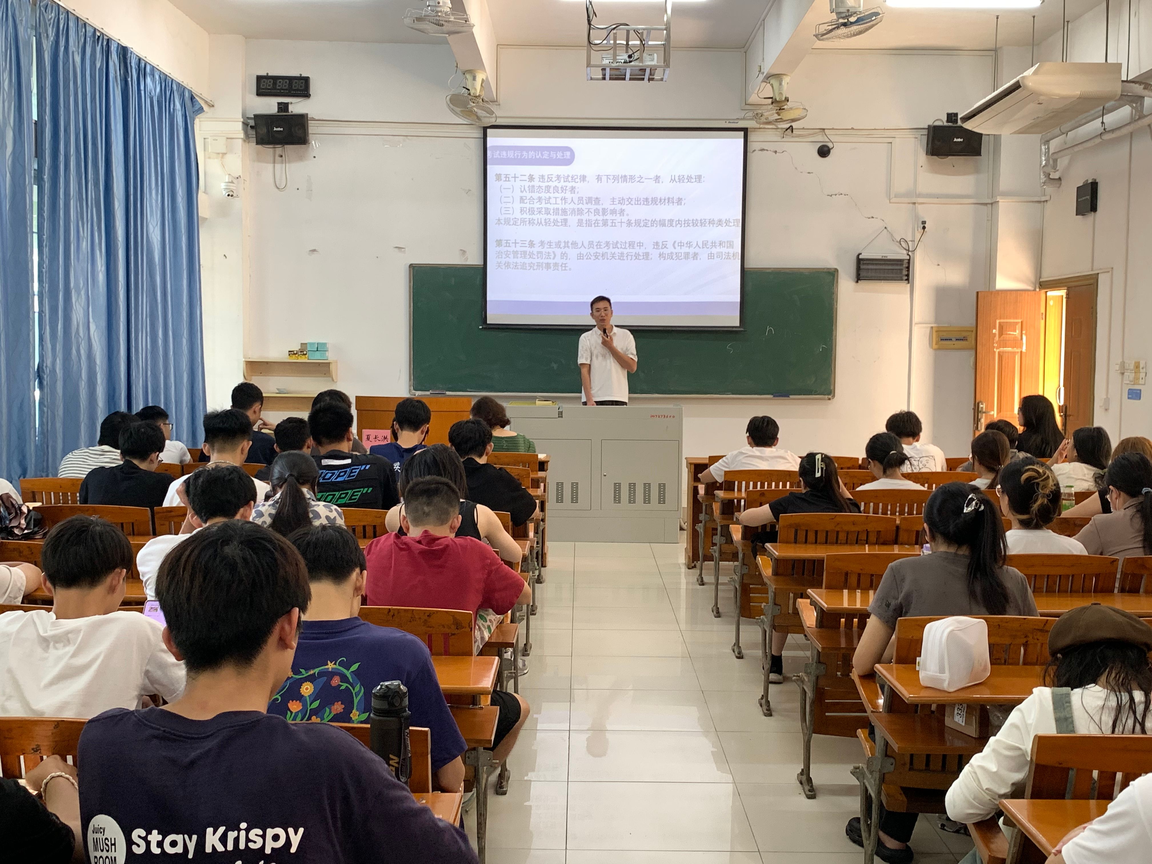 会上,夏老师向同学们细致入微地介绍了考场规则及考试违规行为的认定与处理,叮嘱同学们严肃考风考纪。随后,何书记结合自身监考、巡考经验,再次要求同学们务必做到诚信考试,并向在座的同学们提出三点建议:一是加强学业反思,总结经验教训;二是学会向老师、同学求助,及时补齐学业短板;三是合理规划学习时间,提升复习效率;最后,何书记和夏老师预祝同学们顺利通过考试。