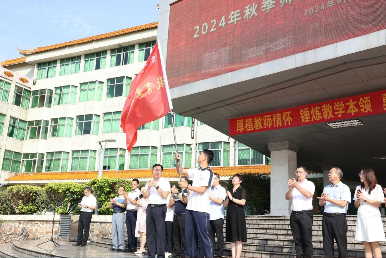 党委书记谢冠华为实习队伍授旗,这面鲜艳的旗帜象征着秋季教育实习师范生们即将踏上新的征程。