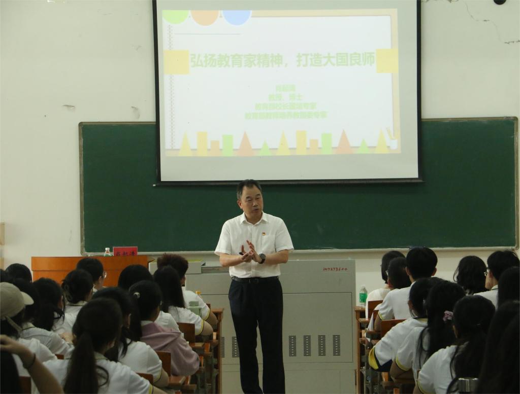 肖起清从“钱学森的教育之问”为切入,引导师生审视当前中国教育的现状及存在问题,从而聚焦到解答“钱学森之问”的关键,即“教育家精神”的培养上。他结合中外教育家的教育理念,阐述了习近平总书记所提倡的“教育家精神”的精神要义与丰富内涵,并在此基础上,结合师范生的特点,提出了大国良师职业锤炼的实践路径,鼓励师范生着眼大湾区教育发展以及乡村振兴背景下的乡村教育,发展个人兴趣,培养守正创新、超越自我、不畏艰难的精神品质,勇于挑战自我,注重提升教师形象礼仪。此外,肖副董事长还特别强调师范生要树立正确的教师观念、职业观念和员工观念,践行教育初心,坚守教育使命,不断提升自身专业素养和教育能力。