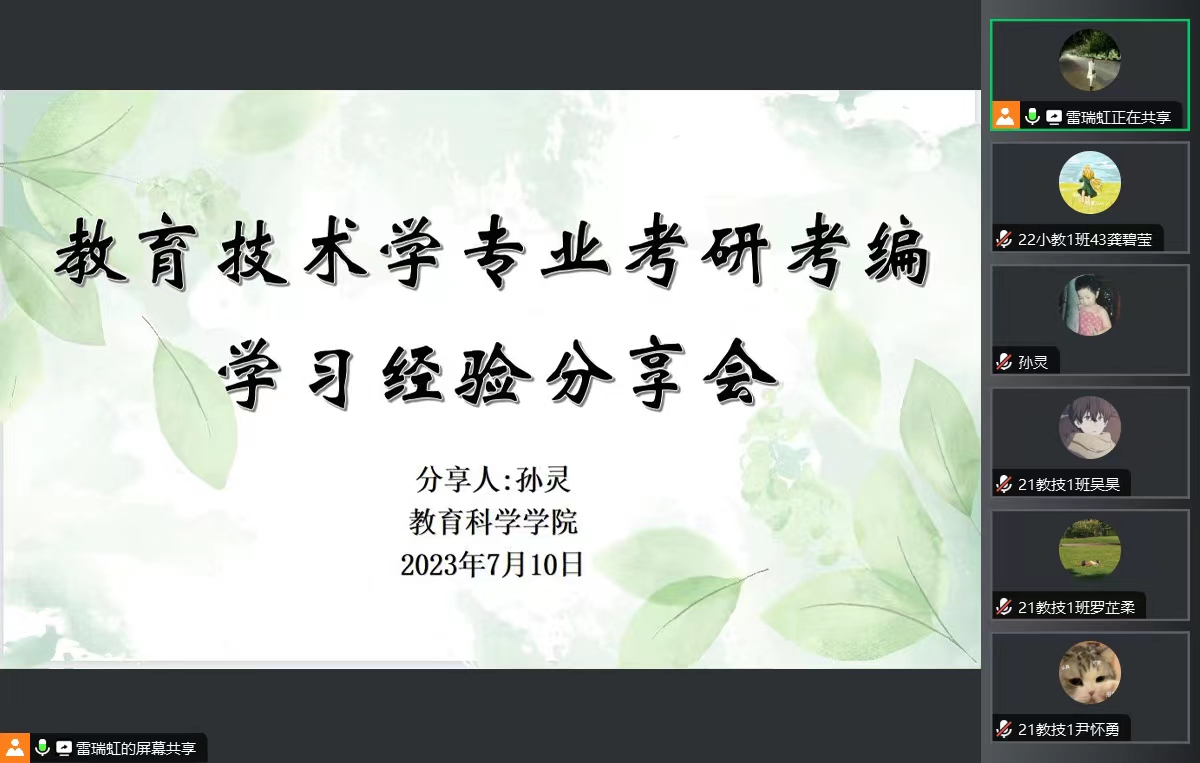 7月10日,特邀2021届教育技术学员工孙灵参加教育技术学专业考研考编经验线上分享会。孙灵围绕着“择校经验、学习方法、资源查找、时间安排”等方面,分享了自己考研考编的经验技巧。