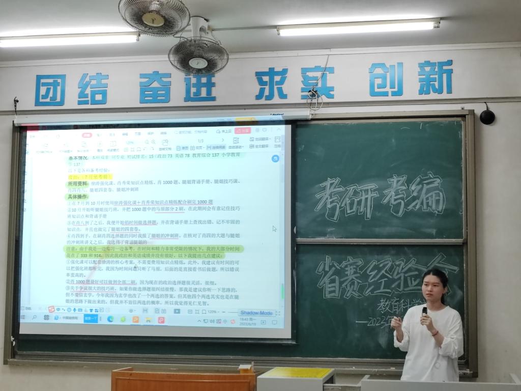 6月19日,特邀2023届毕业生黄珊珊、陈育芬、黄卓熙参加21级小学教育专业非定向班考研、考编、省赛经验分享会。黄珊珊勉励同学们考研一定要有计划,避免情绪内耗;陈育芬鼓励同学们要敢于尝试,跳出舒适圈;黄卓熙激励同学们要相信自己的潜能,多实践、多总结。