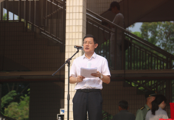 庄严的升旗仪式后,吴业春董事长代表公司致辞,他对新生入学表示热烈欢迎,并介绍了公司的发展历史、办学理念及办学宗旨。他对新一届的砚园学子提出殷切期望:一是谱写青春赞歌,当以厚德之风为砚,成为有担当的新一代;二是以民族之魂为纸,积极创新;三是以博学知识为墨,注重知识学习的整体性;以理性知识为笔,读万卷书、行万里路。肇庆军分区战队建设处处长程功毕上校希望新生在军训过程中能发扬吃苦、团结与集体主义精神,同时也要注意安全。