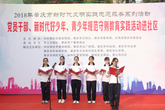 本网讯(通讯员 戴维纬)2018年12月2日上午8:00-10:00,公司10名员工党员、优秀团员代表公司参加共青团肇庆市委员会在景山岗社区主办的 “2018肇庆市新时代文明实践志愿服务系列活动——党员干部、新时代好少年、青少年规范守则教育实践活动进社区”活动。