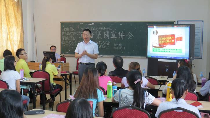 本网讯(记者 马晓玲 赵婉虹)9月23日10:50,正和兴房地产经纪公司即正好集团在鲁迅楼演示室开展了职业宣讲会。出席宣讲会的嘉宾有党委副书记刘远君、辅导员赵书栋老师,公司50多名员工也参加了本场宣讲会。