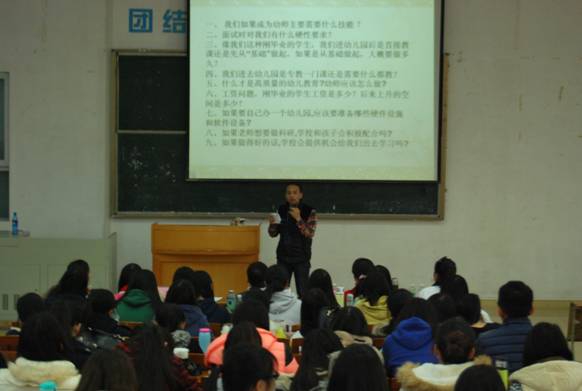 此次讲座,两位员工结合自身教学和管理工作经验以及目前社会对学前教育人才的要求等实际情况,深入浅出,娓娓道来,不仅让同学们对幼儿教师的职业有了更深的认识,也对同学们明确学前教育专业教师在今后的发展目标和努力方向有重要的启示意义。