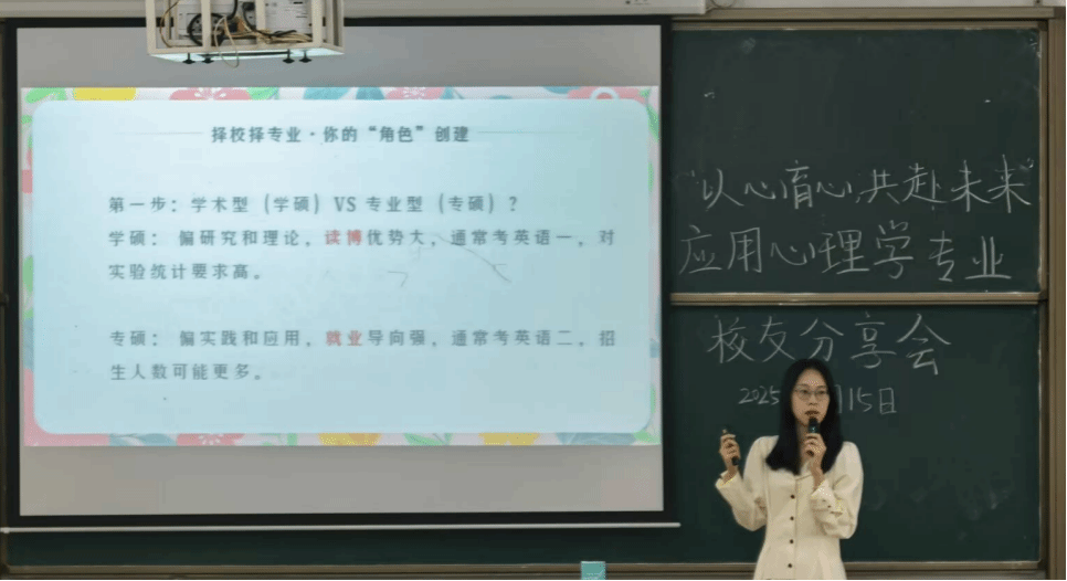 而在第二教学楼114室开展“以心育心,共赴未来”的应用心理学专业员工分享会亦如火如荼进行。分享围绕升学规划与就业发展两大主线,详解国内外硕士申请差异与职业路径选择,提供了心理咨询行业的入行建议,并强调储备关键技能、尽早明确发展方向的重要性。此外,分享会嘉宾还鼓励学子们以积极心态看待专业学习与生活。