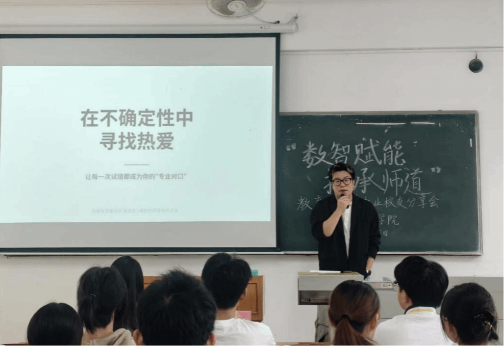 与此同时,第二教学楼314室以“数智赋能,技承师道”为主题的教育技术学专业分享会如期举行。现场不仅解读了专业发展前景,分享了跨界职业经验,还着重强调在大学期间培养数据分析等实用技能,对考研、考编规划提供了针对性建议。交流会还设置了互动答疑环节。