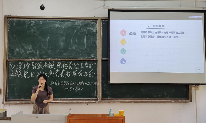 在师范生技能大赛经验分享环节,梁婉仪就选拔赛普遍的问题、线上参赛的注意事项、如何创新教学设计与国赛的相关事宜等四个方面进行经验分享,鼓励同学们多去发掘新想法,不断夯实自身师范生技能。余嘉祺详细介绍了省赛的选拔过程和赛程安排,她鼓励同学们保持自信的态度,勇敢尝试,并有选择性地、批判性地吸纳他人的意见。