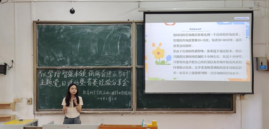 两次会议分别以“挺膺担当砺青春,奋楫笃行向未来”和“以学增智强本领,砥砺奋进正当时”为主题,其中,2022届倪诺、2023届陈心怡、2024届许思曼、周幸柔、黄思瑶、郑丹璇等优秀员工代表进行升学、就业经验分享;同时,2021级优秀员工代表梁婉仪、余嘉祺、潘锐、张晓晨进行省赛经验分享。应用心理学专业教师代表唐辉、党支部书记陈慧妍出席了本次会议,应用心理学专业各年级员工共100余人次参加。