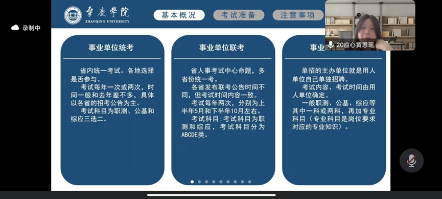 关于考编经验,黄思瑶从编制考试基本概况、考试内容与准备、注意事项和心态调节等四个方面展开经验分享,她指出要珍惜机会,大胆尝试,脚踏实地地做准备。郑丹璇则详细介绍了获取相关就业信息的渠道和笔试备考的资料资源,鼓励同学相信自己,专注做好当下事。