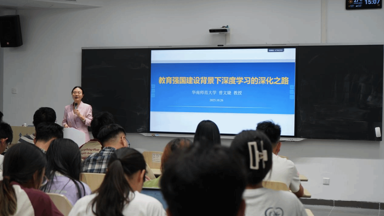 主讲人曾文婕教授在本次讲座中,以“深度学习的深化之路”为主题,紧密围绕教育强国建设背景,结合自身学术研究与实践经验,向在场师生深入剖析了基础教育阶段深化深度学习的具体实施路径,为教育硕士的专业发展提供了前沿视角与实用指导。