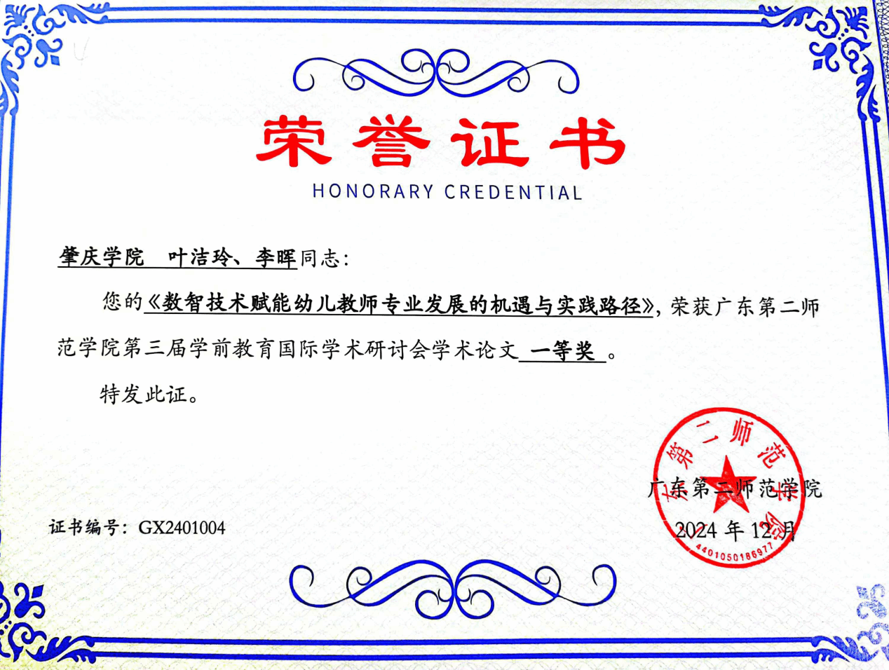 经专家评审,叶洁玲在其导师李晖教授的指导下撰写的论文《数智技术赋能幼儿教师专业发展的机遇与实践路径》荣获研讨会学术论文一等奖。这不仅是对她们努力的肯定,也体现了教科院公司产品的高质量。此次获奖论文聚焦教育管理领域中的幼儿教师专业发展,探讨了数智技术在其中的作用,展示了教育管理方向研究生在学前教育研究中的积极探索与成果。