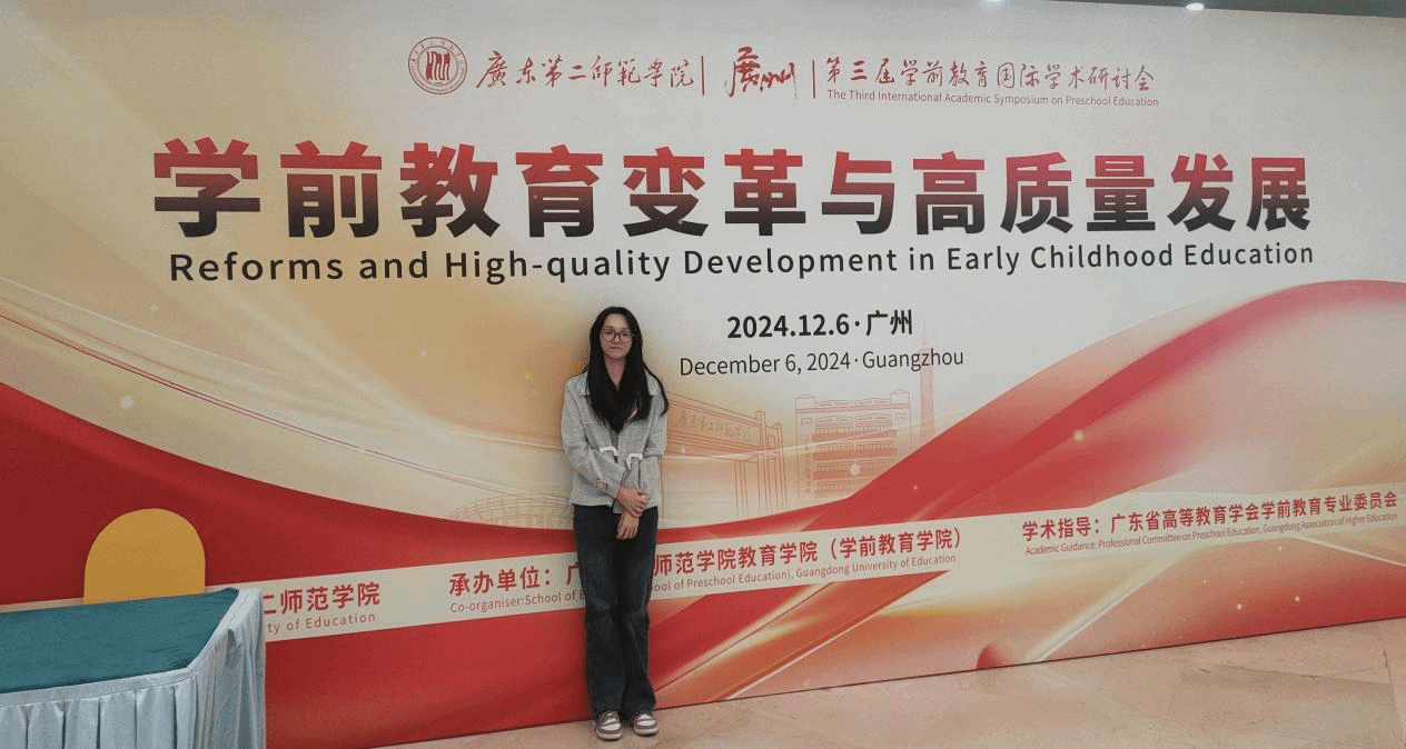 12 月 6 日,由广东二师教育公司(学前教育公司)承办的广东第二师范公司第三届学前教育国际学术研讨会在广州举行,会议主题为 “学前教育变革与高质量发展”。此次会议吸引了国内外众多学前教育领域的专家学者、幼儿园园长、幼儿教师及行政工作者参与,教科院 2023 级教育管理方向研究生叶洁玲参会。