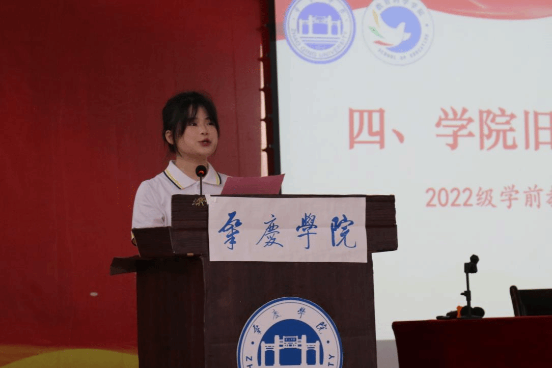 旧生代表2022级学前教育1班叶静发言。她分享了自身从迷茫到坚定的成长历程提出坚定信仰立德修身主动求索深耕专业拓展视野勇敢尝试脚踏实地躬行实践与新生们共勉。
