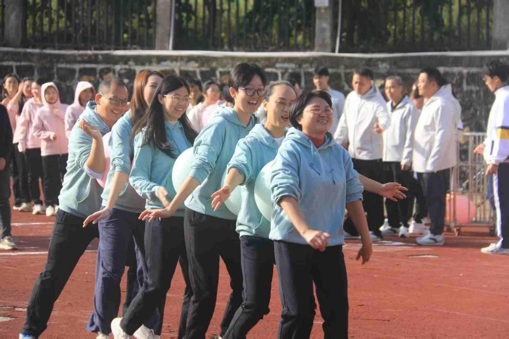 教职工赛场同样亮点纷呈。老师们褪去讲台沉稳,在短跑、跳远、实心球项目中奋勇争先,尽显师者力量;定向越野项目中,老师们辨向识标、通力协作,展现脑力与体力的双重实力;趣味运动场上,“毛毛虫”“心心相印”“九宫格飞盘”等项目轮番上演,老师们尽情投入,在欢声笑语中凝聚团队力量。