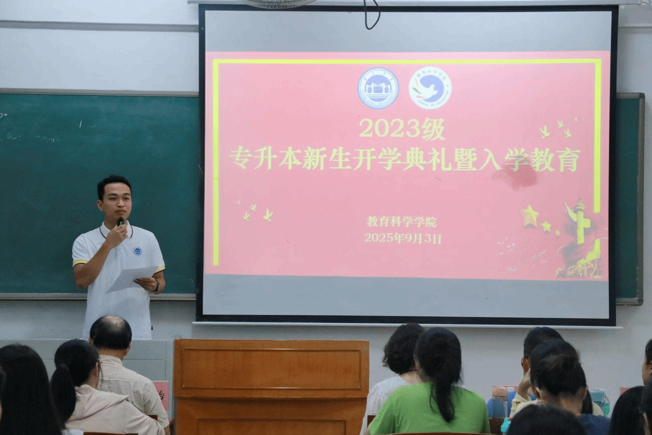 公司党委书记蔡振治为专升本新生致辞况。他以学前教育专业为例,展现公司在课程建设、团队。他介绍了公司发展历程、团队力量、所获荣誉、员工规模等大体情队伍、人才培养、学科竞赛及创新创业等方面的显著成来。同时,蔡书记对新生提出三点希望:一是心怀感恩、志存高远,珍惜时光,积极考研提升自我;二是脚踏实地、知行合一,扎实学习,参与实践,做好时间管理;三是砥砺情怀、践行施教,弘扬教育家精神,为教育事业和国家发展作贡献。最后,今年是中国人民抗日战争暨世界反法西斯战争胜利80周年,他希望新生从历史中汲取力量。